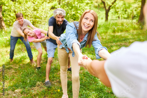 Junge Leute ziehen an den Händen beim Kräftemessen