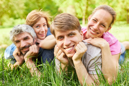 Junge Frau entspannt sich mit Freunden auf einer Wiese