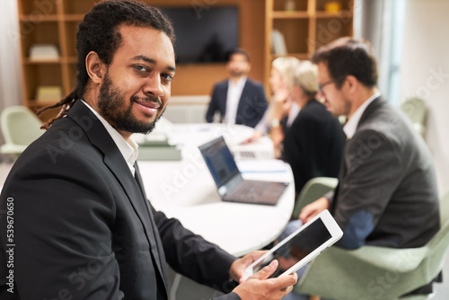 Selbstbewusster Manager mit Tablet Computer im Meeting