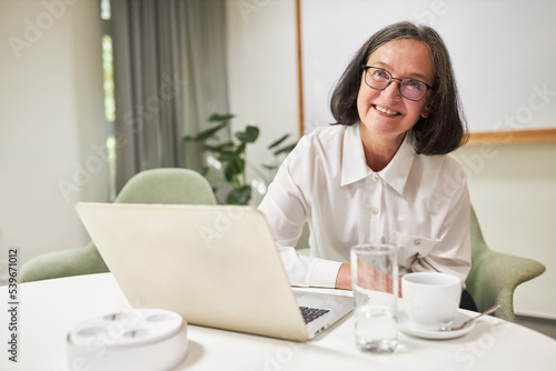 Ältere Geschäftsfrau mit Kompetenz und Erfahrung am Laptop