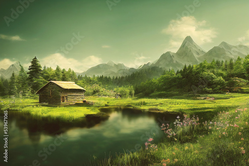 Beautiful summer landscape with hut, lake and mountains