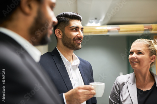 Drei junge Geschäftsleute beim entspannten Smalltalk