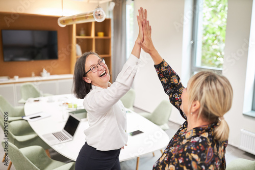 Fröhliche Business Frauen feiern Erfolg mit High Five