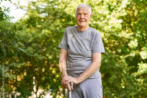 Senior mit Krücke im Garten der Reha Klinik