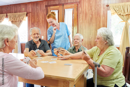 Senioren Gruppe spielt zusammen Skat am Tisch