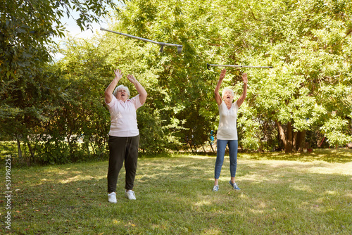 Zwei Seniorinnen werfen ihre Krücken in die Luft