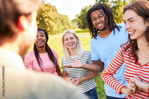 Friends and students having small talk in the park in summer