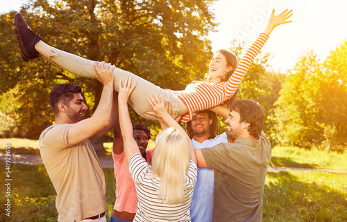 Gruppe junger Leute trägt und hebt eine junge Frau