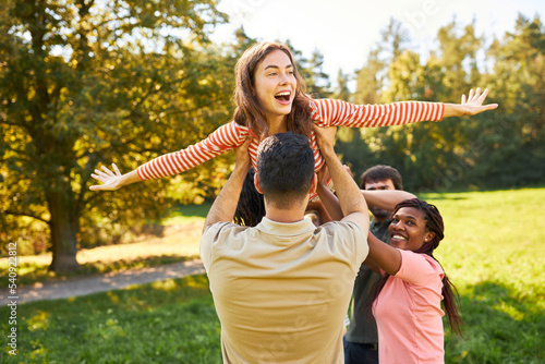 Gruppe junger Leute hebt gemeinsam Frau hoch