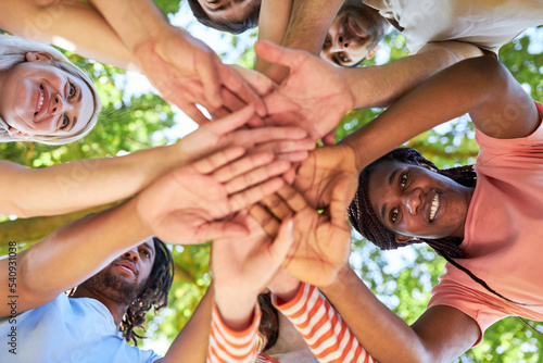 Fröhliche junge Frau und ihre Freunde Hand in Hand