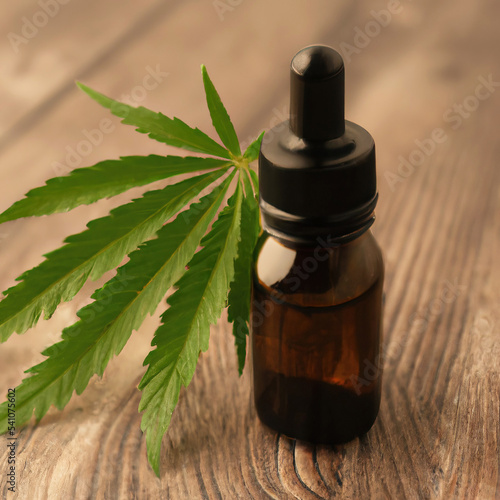CBD oil bottle with cannabis sative leaf on table
