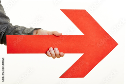 Hands hold red arrow as direction concept