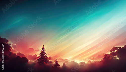 Magical winter landscape scene with colorful clouds and trees