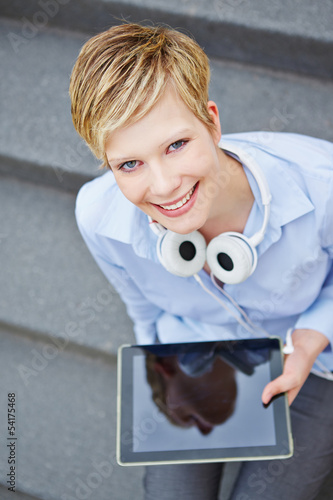 Junge Frau mit Kopfhörer nutzt Smartphone