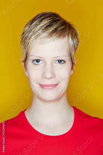 Portrait of a delightful Australian woman in her 40s with short blonde hair, wearing a yellow sleeveless top, exuding confidence and elegance.