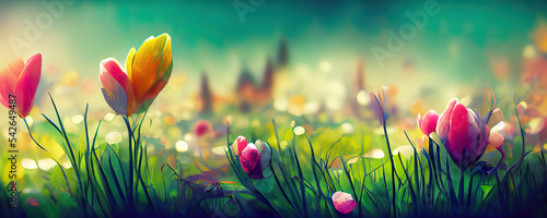 Vibrant springtime garden with colorful tulips and flowers in full bloom