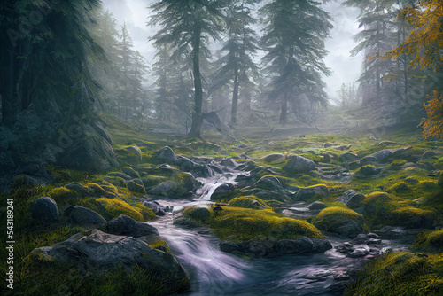 River flowing through green forest nature with trees