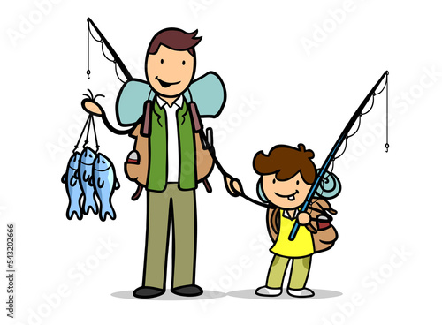 Vater und Sohn mit Fisch an der Angel beim Angeln