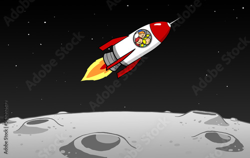 Cartoon Astronaut im Raumschiff fliegt über Mond