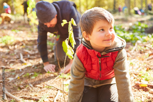 Junge beim Baum pflanzen im Wald als Aufforstung Aktion