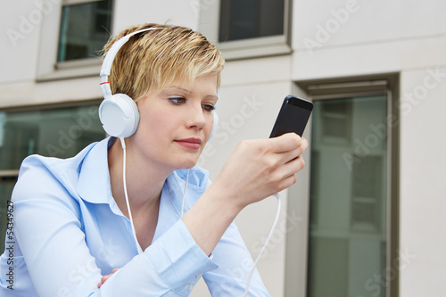 Junge Frau mit Kopfhörer nutzt Smartphone