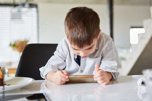 Kleiner Junge baut einen Turm aus Holz Bauklötzen