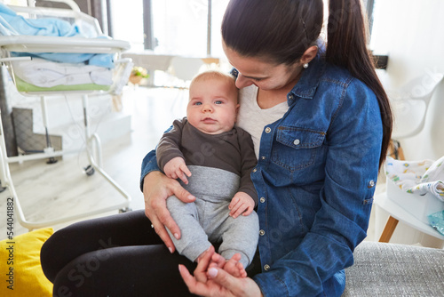 Mutter sitzt im Wohnzimmer mit Baby auf dem Arm