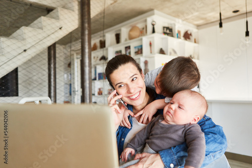 Mutter im Homeoffice telefoniert mit dem Smartphone