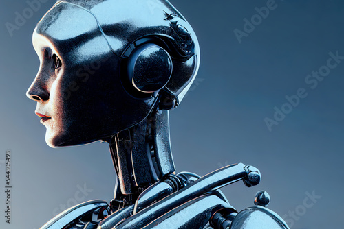 Close-up of a futuristic humanoid robot with high-tech details and glowing eyes