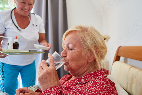 Kranke Seniorin nimmt Medikamente ein mit Glas Wasser