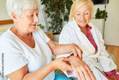 Altenpflegerin hilft Seniorin beim Hausschuhe anziehen