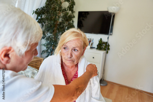 Altenpflegerin hilft Seniorin beim Hausschuhe anziehen