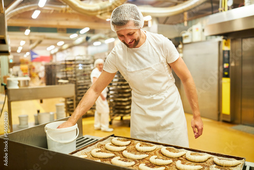 Lehrling in der Großbäckerei streut Mohn auf Croissants