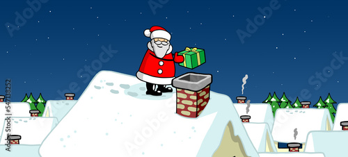 Cartoon Santa Claus with gifts on roof