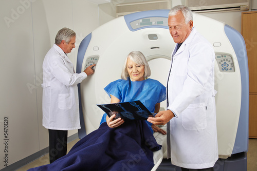 Radiologe redet mit Seniorin auf MRT