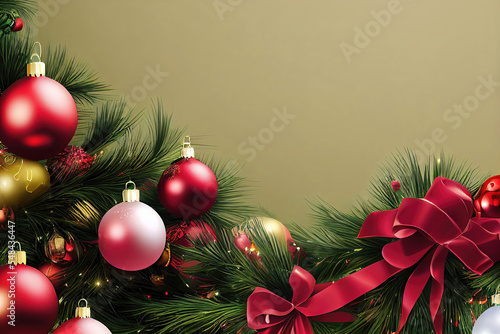 Merry Christmas and New Year's decorative frame with baubles and poinsettias