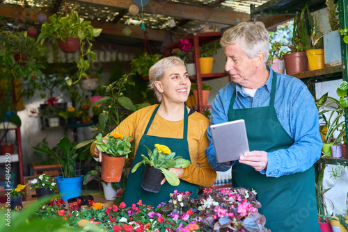 Gärtner und Floristin kontrollieren Qualität der Pflanzen