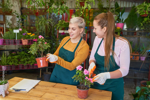 Zwei junge Floristen beim Rückschnitt von Zimmerpflanzen
