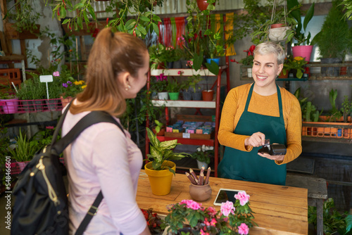 Floristin im Blumenladen telefoniert mit dem Smartphone