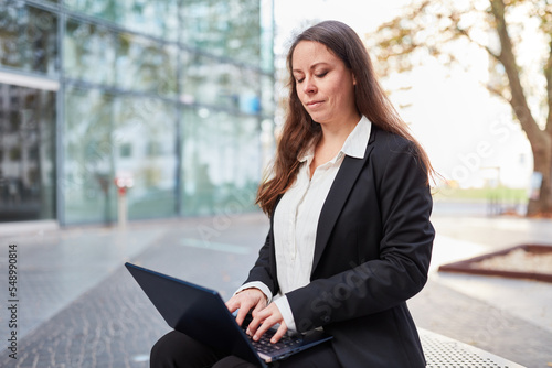 Modern businesswoman working outdoors in city on laptop computer