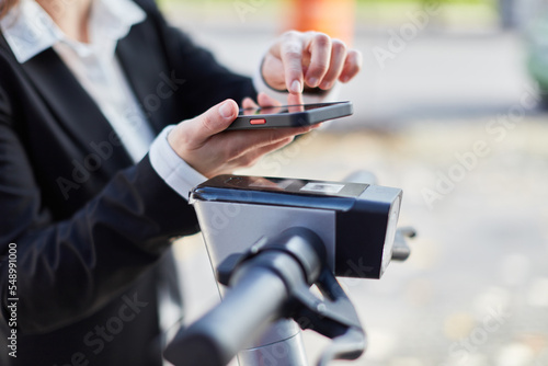 Hand of businesswoman renting e-scooter with mobile phone
