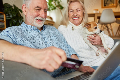 Glückliches Senioren Paar am Laptop mit Kreditkarte
