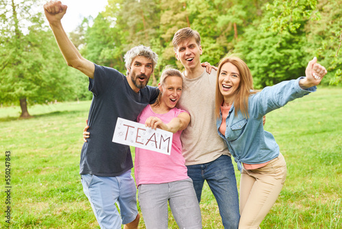 Junge Leute als Sieger Mannschaft halten Schild mit Team