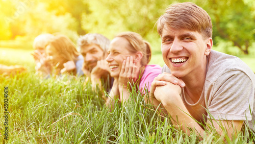 Lachender junger Mann liegt vor Gruppe Leute auf Wiese