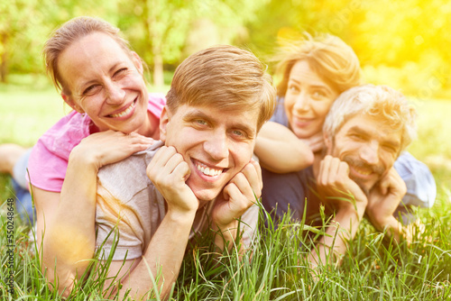 Zufriedene Freunde liegen zusammen im Sommer im Park