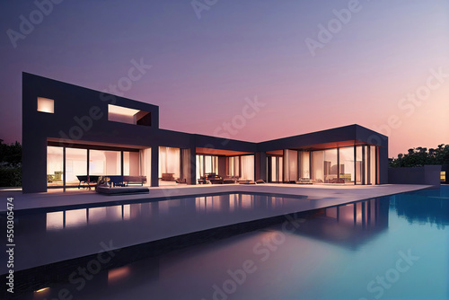 Luxury villa with infinity pool overlooking a sunset on the sea