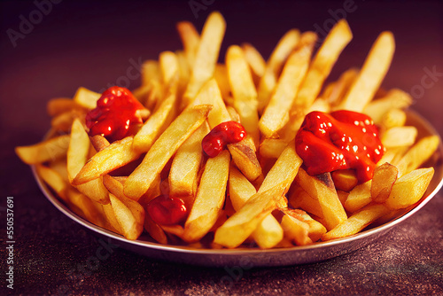 Plate of french fries with ketchup as junk food concept illustration