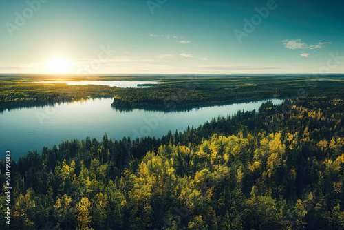 Aerial view of beautiful forest and river or lake in sunshine