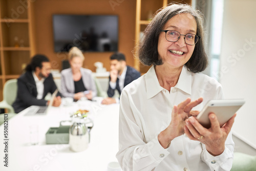 Glückliche Geschäftsfrau mit Klemmbrett im Meeting