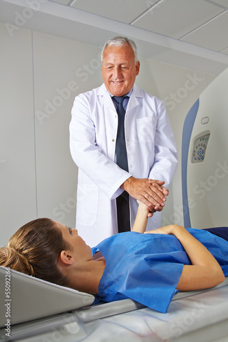 Arzt beruhigt Patientin vor MRT